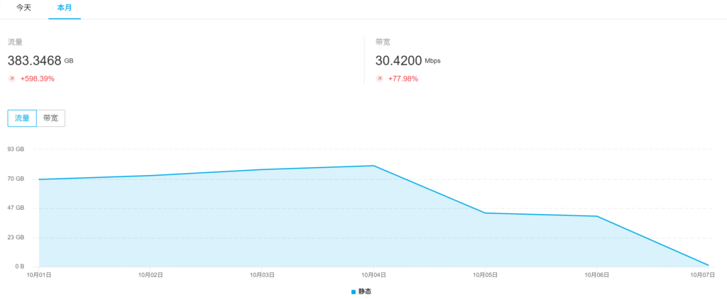 七牛cdn一定要开流量预警,没有预警的情况下是欠费后才能知道,好像有欠费不透支策略不过cdn流量统计有延时,盗刷流量如图所示: